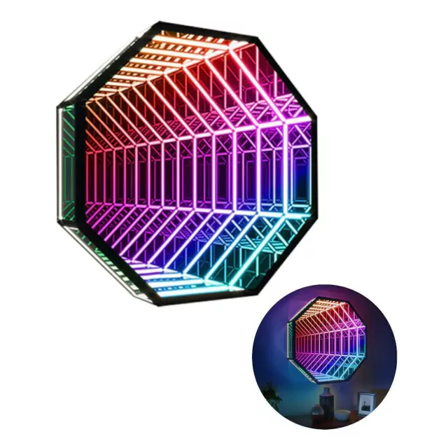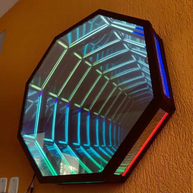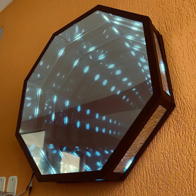 Espelho infinito cria uma série de reflexões menores e menores que parecem regredir em uma distância infinita, trazendo uma ilusão de ótica incrível, dessa forma traz encanto e suspense para o local no qual estiver instalado. Não tem como passar por um desse e não parar, admirar, se questionar, sorrir e fotografar.
